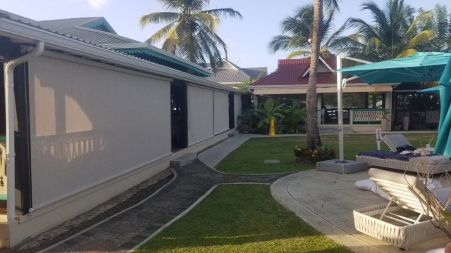 The systems are custom made and are operated manually or motorized. The vertical drop awnings can be mounted on the ceiling or on wall surfaces.