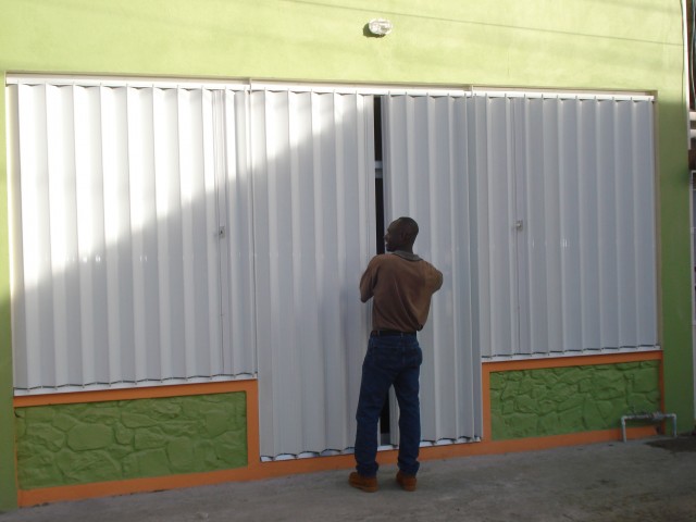 Rolling Shutters can be motorized with a manual override system in the event of electrical failure. Remote control is also available. Caribbean Awning also uses shutters as interior security for open bars, garage type applications and security for store fronts.