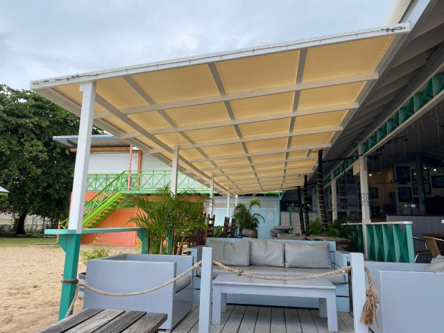 Ferrari 502, 17.4oz per sq yard, is the best fabric for this type of cover providing a cooling effect. The Ferrari 502 , is heat sealed and cut to specifications; is mounted on the Back end of the structure using awning rail (either against the wall that the structure rests on or on the framework its self)